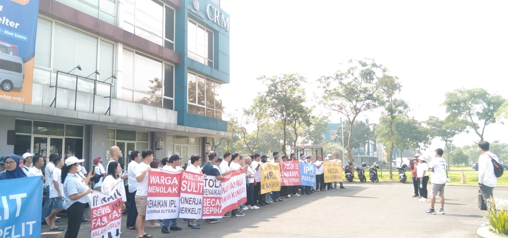 Warga perumahan Suvarna sutera, menggelar aksi damai di depan kantor Customer Relationship Management (CRM) selaku pengelola. Dalam aksinya selain berorasi, lebih dari 900 warga yang setuju menolak kenaikan IPL dan diwakilkan oleh puluhan warga yang ikut dalam aksi damai juga membentangkan berbagai spanduk sebagai bentuk penolakan atas kenaikan tarif Iuran Pemeliharaan Lingkungan (IPL) yang terus naik setiap tahunnya dan dilakukan secara sepihak tanpa melalui musyawarah terlebih dahulu dengan warga, Sabtu (13/07/2024).